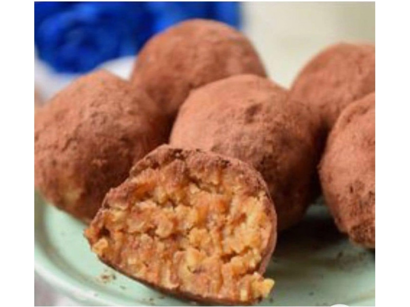 - Перемешайте ингредиенты. Сформируйте из массы шарики и обваляйте их в кокосовой стружке или какао.